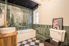 The stylish bathroom includes a bath with an overhead shower, a toilet, and a basin set within a vanity unit, providing useful storage.