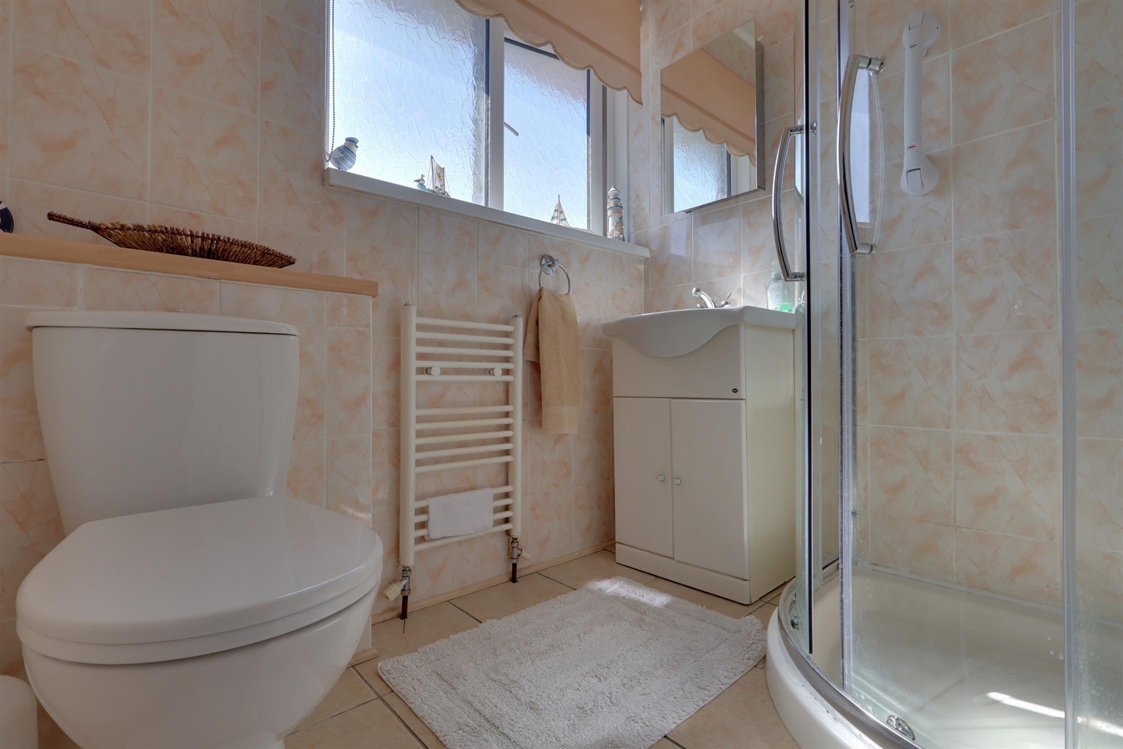 The bathroom includes an obscure double-glazed window to the side elevation, a low-level WC, a vanity wash hand basin, a ladder radiator, a shower cubicle, an extractor fan, and fully tiled walls.