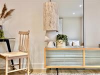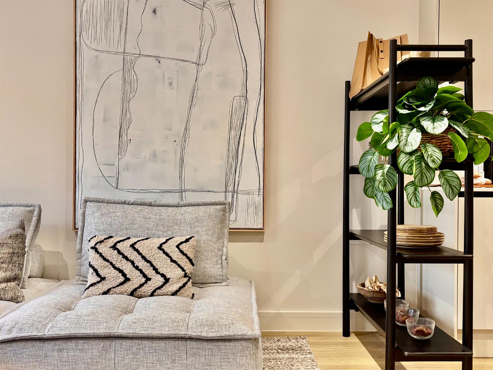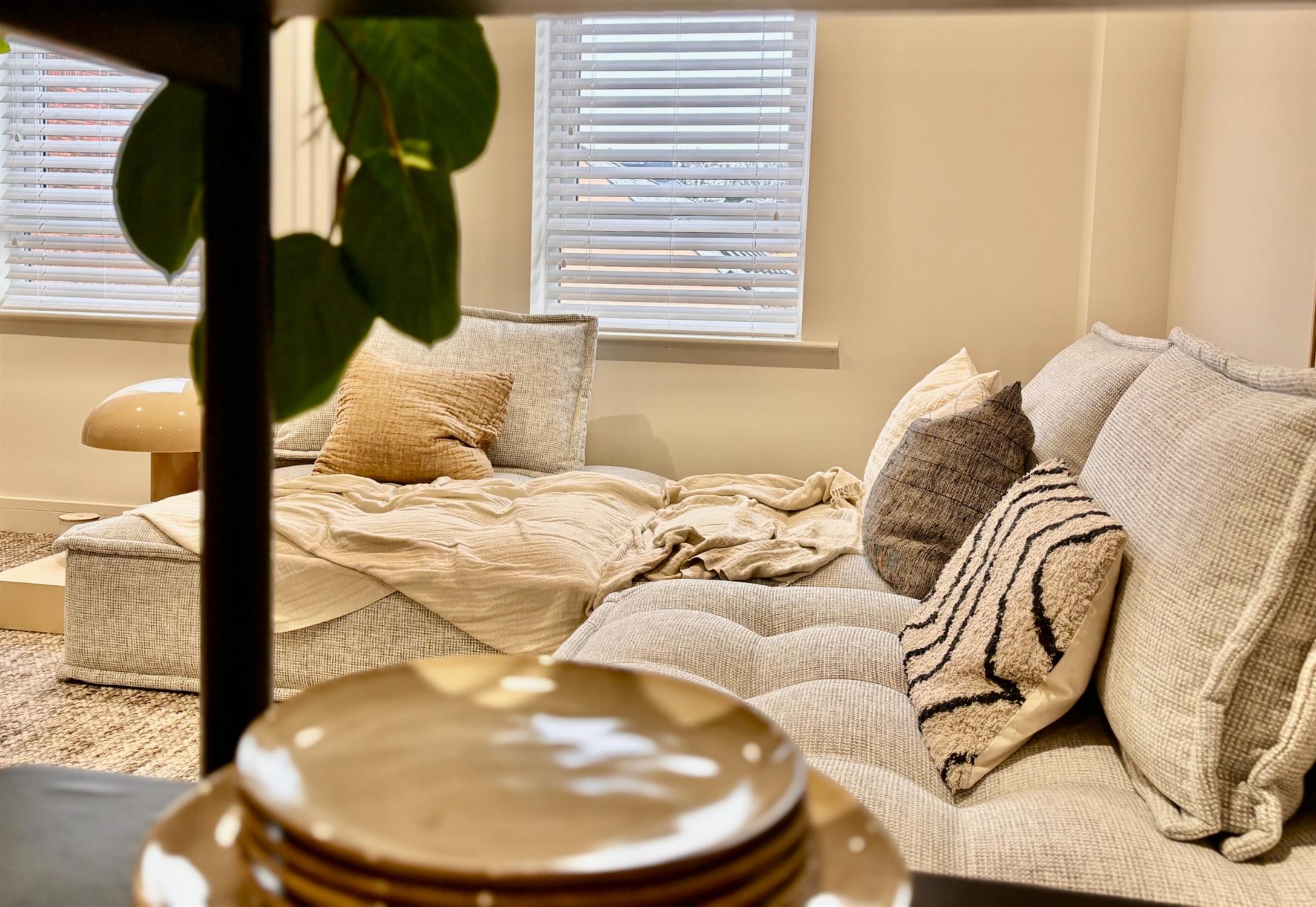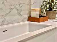 The handless kitchen in pastel stone with slimline Quartz worktop includes AEG double oven, dishwasher, induction hob, fridge-freezer, washer/dryer, inset sink and Quooker instant hot water tap.