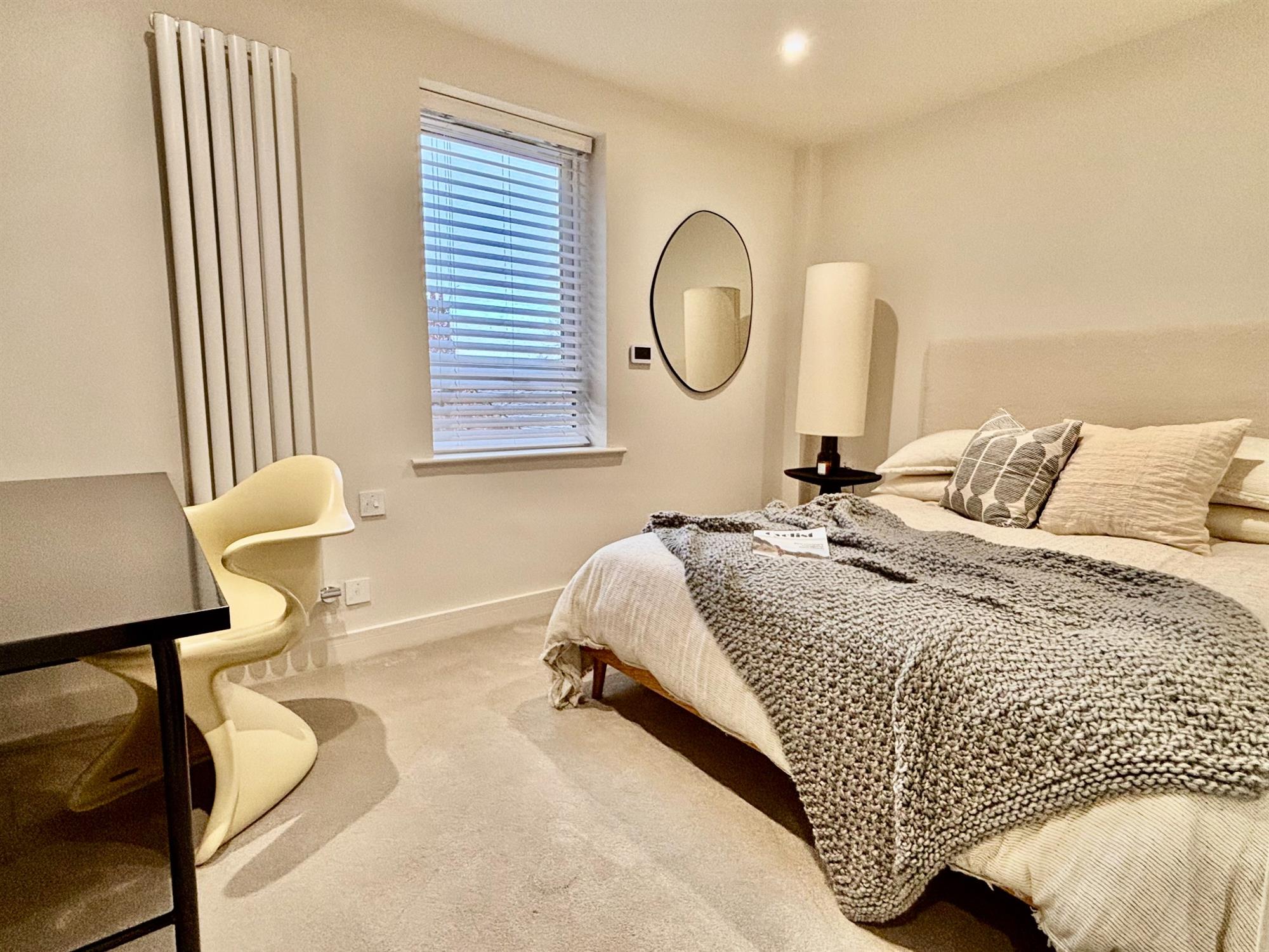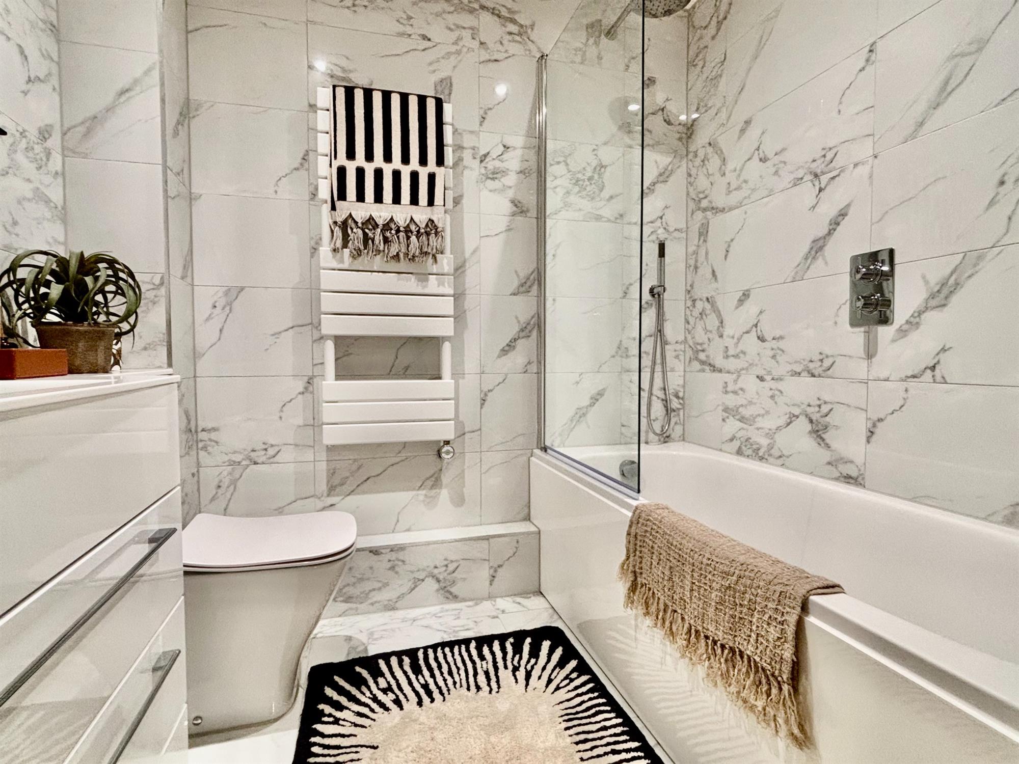 The two bedrooms have slimline radiators and power points for TV. The bathroom is fully tiled, has a vanity unit with drawers and solid mineral worktop into sink, bath with double shower over and toilet.