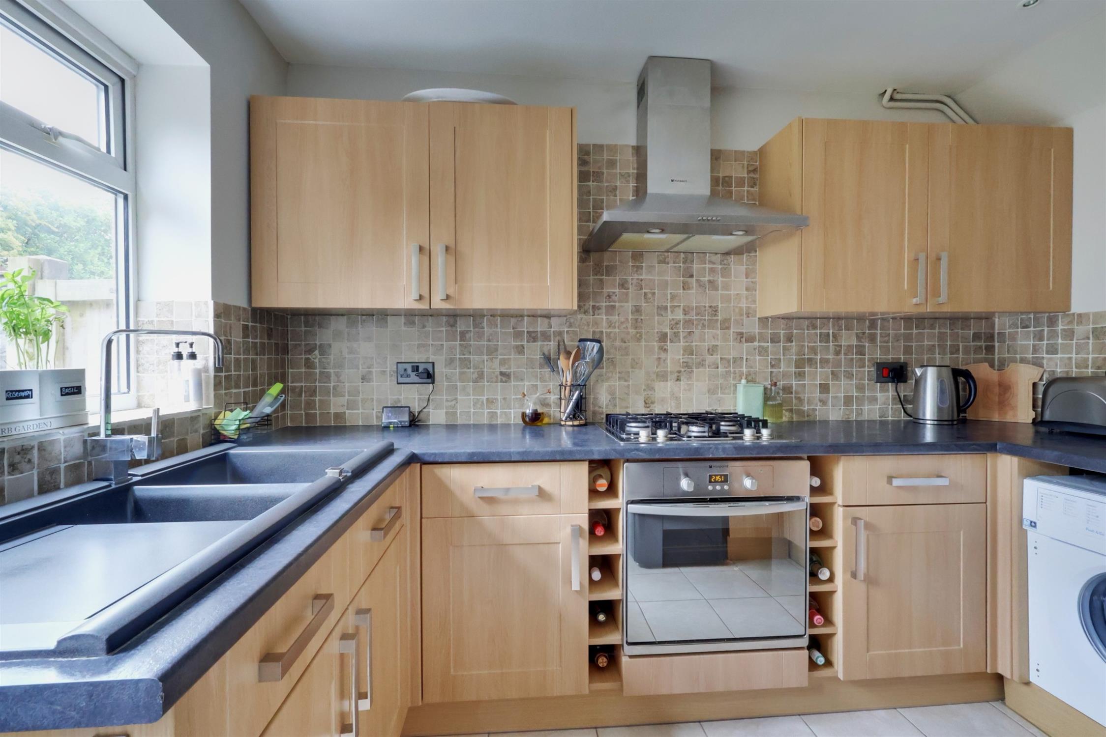 Upvc window and door accessing the rear garden. Range of floor and wall units with sink unit inset into matching work surface with tiled splashbacks. Built-in gas hob with oven below and extractor over. Integrated washing machine.