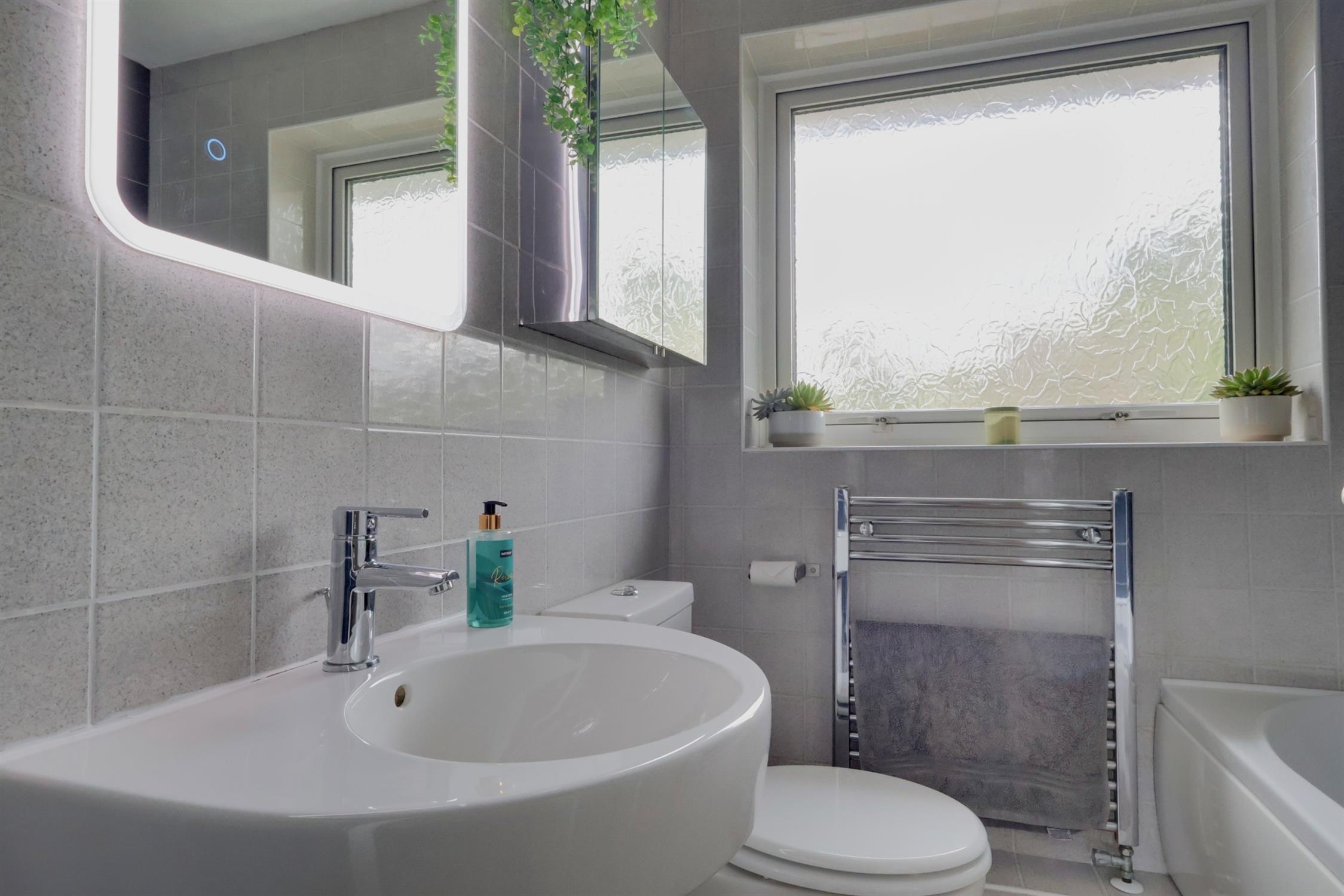 Modern white suite comprising panel bath with independent shower over. Pedestal wash hand basin with illuminated mirror above. Low level WC. Tiled splashbacks. Heated towel rail. Obscured double glazed window to the rear aspect.