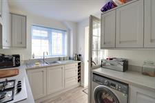 Fitted with a modern range of wall and base units with worksurfaces over, integral electric double oven and hob with extractor hood over, spaces for washing machine and fridge, inset sink and drainer, rear aspect double glazed window, double glazed door to the conservatory.